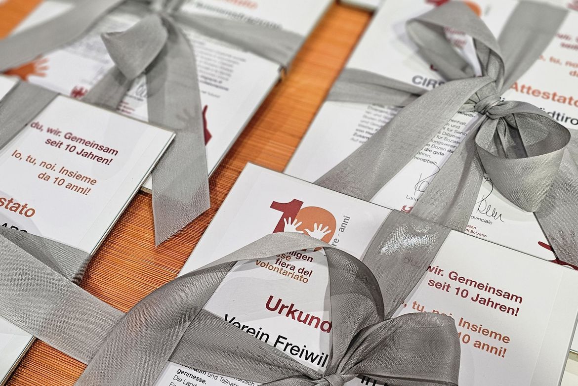 Im Rahmen der Eröffnung der 10. Ausgabe der Südtiroler Freiwilligenmesse wurden jene 6 Vereine mit einem kleinen Festakt gewürdigt, die seit Beginn an dabei sind: Donne Nissà Frauen APS, Lebensberatung für die bäuerliche Familie, Verein für Sachwalterschaft VFG, CIRS Südtirol, Verein Freiwillige in Familien- und Seniorendienst EO sowie Montessori.coop.