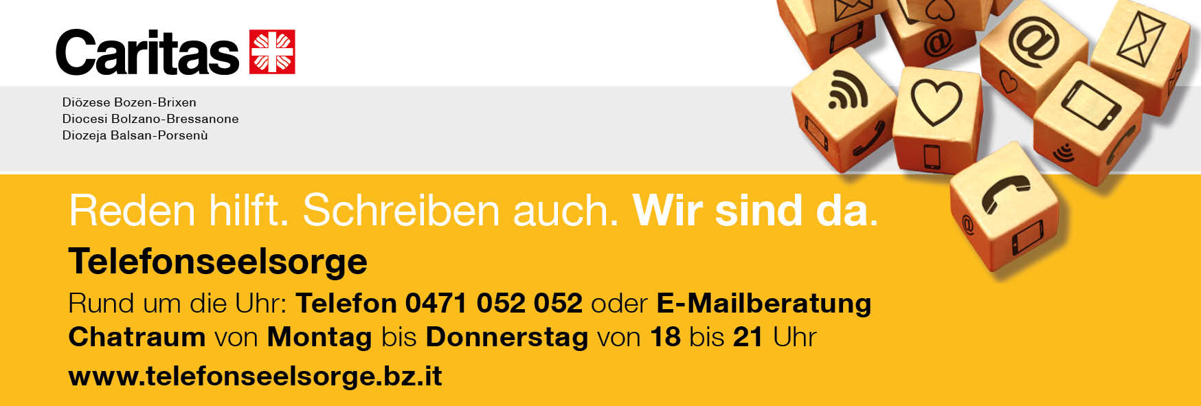 Unter der Nummer 0471 052 052 rund um die Uhr und bei der Onlineberatung über E-Mail und Chat (https://telefonseelsorge.bz.it/) stehen ausgebildete und einfühlsame Gesprächspartner und –partnerinnen bereit für alle, die anonym mit jemand Außenstehendem über ihre Gedanken, Sorgen und Ängste reden oder sich schriftlich austauschen möchten.